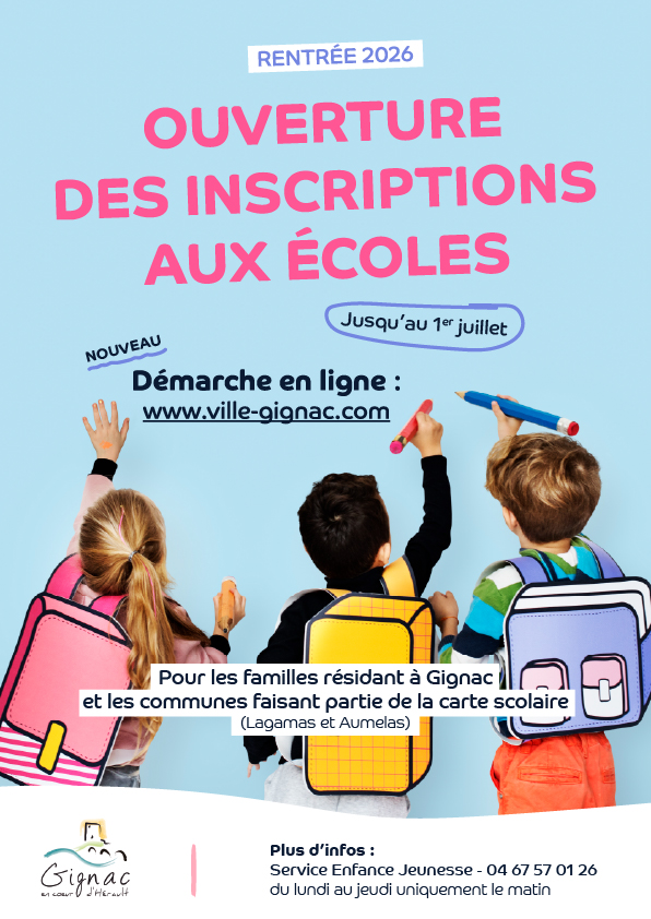 Pour les enfants qui entrent en petite section de maternelle, en CP ainsi que pour les nouveaux arrivants Uniquement pour les habitants de Gignac, Lagamas et Aumelas > Formulaire d'inscription ICI Infos : Mairie - Service enfance jeunesse 04 67 57 01 26 (du lundi au jeudi de 9h à 12h)